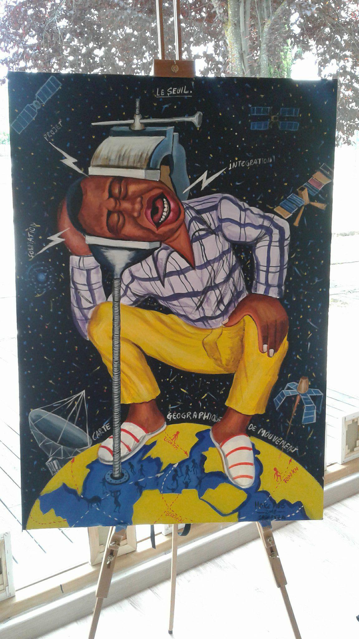 Moke Fils è un esponente della pittura popolare, dell’arte non accademica, appartiene all’Association of Popular Painters, nell’acronimo APPO, poiché tra i più grandi nomi della pittura di “strada” Congolese. La quotidianità è la sua musa. L’opera, autobiografica, racconta del suo arrivo in Europa, delle difficoltà avute nell’integrarsi e del suo cambiamento artistico e sociale. Elemento ricorrente di questa nuova fase artistica sarà infatti la velocità della vita e la tecnologia, come nuovo mezzo di “contatto”. Il progetto si ispira alle mancate speranze, allo scoraggiamento che l’uomo subisce nel mutamento. Per la realizzazione dell’opera, l’artista congolese raccoglie elementi sul posto, studi e attenzioni sull’essere un emigrante a Cosenza. L’opera esprime lo sconforto del cambiamento ( la morsa che stringe l’apparente calma della quotidianità) così come la riuscita socializzazione: l’uomo ha un posto sul mondo.