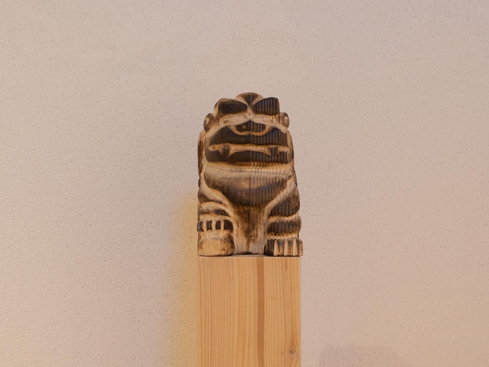 Testo critico del curatore: L’architettura dei BoCs, vista su google immagini prima di partire, ricorda una residenza nordica, un luogo alieno atterrato nel profondo sud dell’Europa. Che ruolo può avere nel sistema dell’arte o per la cittadinanza cosentina avere più di venti artisti nazionali e internazionali che si aggirano per la città e che cosa culturalmente possono dare a questa comunità è la domanda che l’artista si è posto prima di scendere da Milano dove vive e lavora. Luca Loreti si è immaginato e immedesimato in un ipotetico artista asiatico che, invitato alla residenza porta parte della sua cultura all’interno di un contesto a lui lontano. L’opera consiste in una scultura in legno di piccole dimensioni raffigurante uno Shishi o Cane di Foo, figura mitologica asiatica comunemente posta all’esterno dei templi in coppia come simbolo di protezione e molto in voga come tatuaggio tradizionale giapponese. L’idea è quindi di realizzare un oggetto che non abbia relazione con il territorio ma che inviti ad indagare una cultura altra rispetto a quella del luogo, un invito ad aprire la mente e a confrontarci culturalmente nel mondo globalizzato in cui viviamo.
