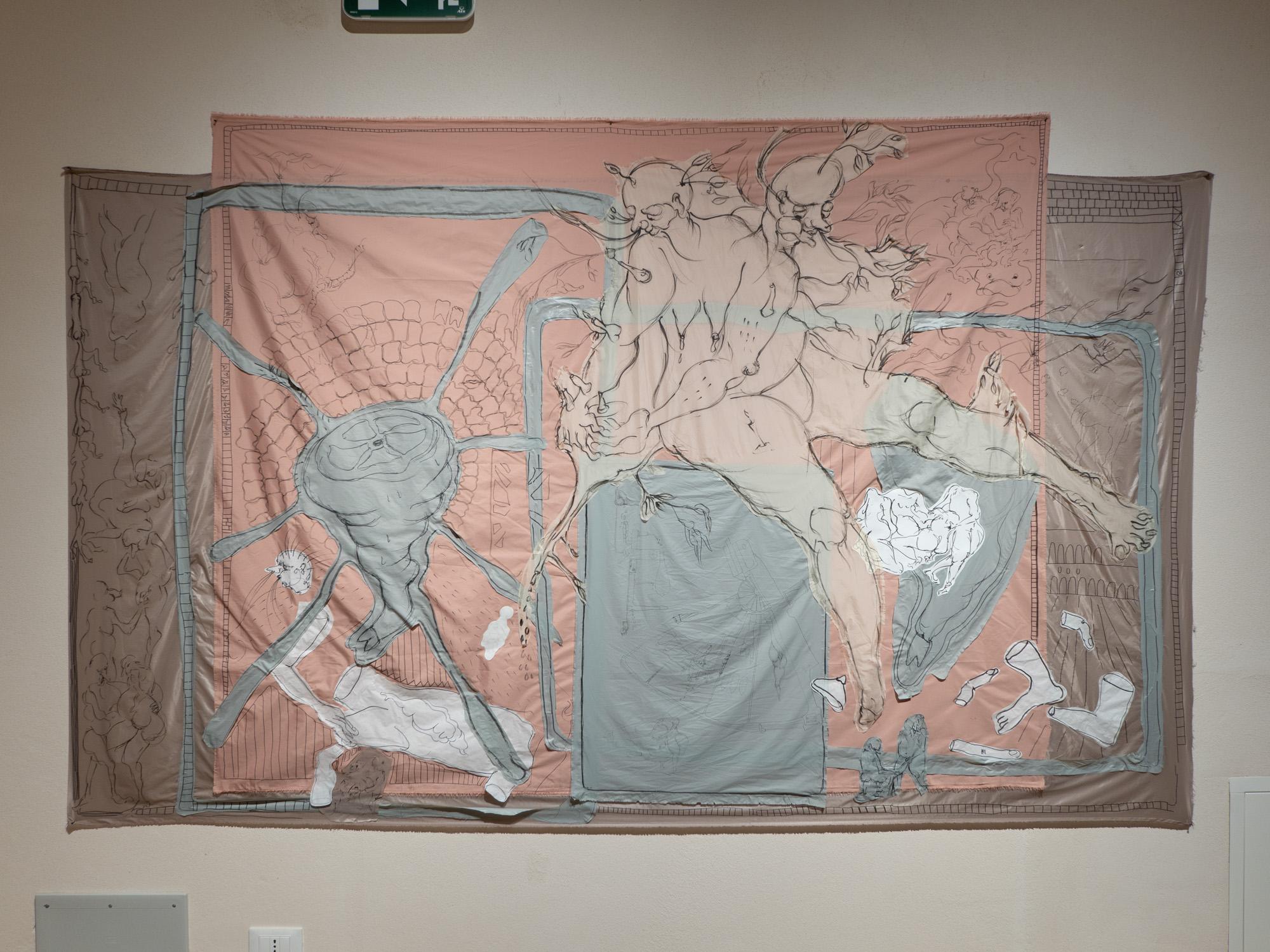 Come di consueto nel suo lavoro, Benni Bosetto si servirà del disegno come trait d’union per una composizione multi-narrativache in questo caso prenderà forma attraverso un collage distoffe colorate e carte. Attraverso una ricerca monografica e sociologica, l’artista sta portando avanti in Residenza uno studio sull’uomo e sulla questione dell’identificazione del corpo nella società, che vede di cultura in cultura l’utilizzo di pratiche e rituali specifici.A ispirare la sua produzione alcune letture quali la biografia dell’inventore Nikola Tesla e dei testi di saggistica sull’astinenza sessuale e alimentare nell’epoca precristiana, come dimostrano i progetti ingegneristici, le parti anatomiche e le figure androgine rappresentate.