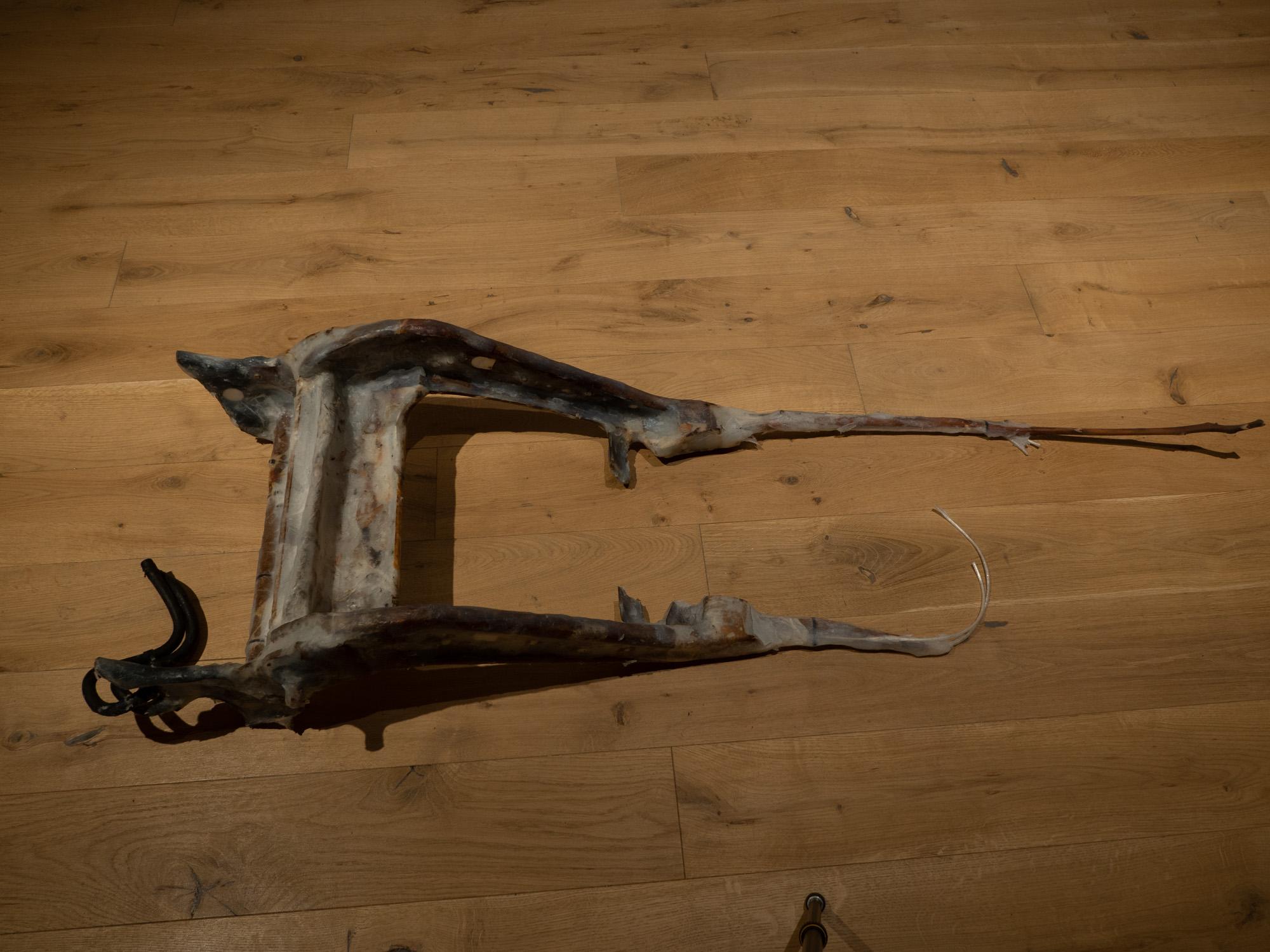Ibridando porzioni di automobilidanneggiate (fornite da un’azienda calabrese specializzata in riparazione di macchinari ferroviari) con volumi riconducibili a masse organiche, Giulia Cenci innesca un processo che parte dall’alterazione della forma originaria dell’oggetto preesistente per generare una creazione dalla nuova significazione. L’artista riproducecon perizia l’articolazione delle diverse parti che compongono un’unica struttura, attratta dalle peculiarità della serialità ingegneristica. La sensazione di vitalità rintracciabile in questo micro-mondo è alimentata dalla presenza in esso di elementi naturali, richiamo immediato alla stratificazione interna dei minerali. La tensione quasi muscolare che conferisce all’opera stessaun aspetto semi vivo ricorda, inoltre, certe specie vegetali infestanti nell’atto di espandersi in modo incontrollato nello spazio circostante.