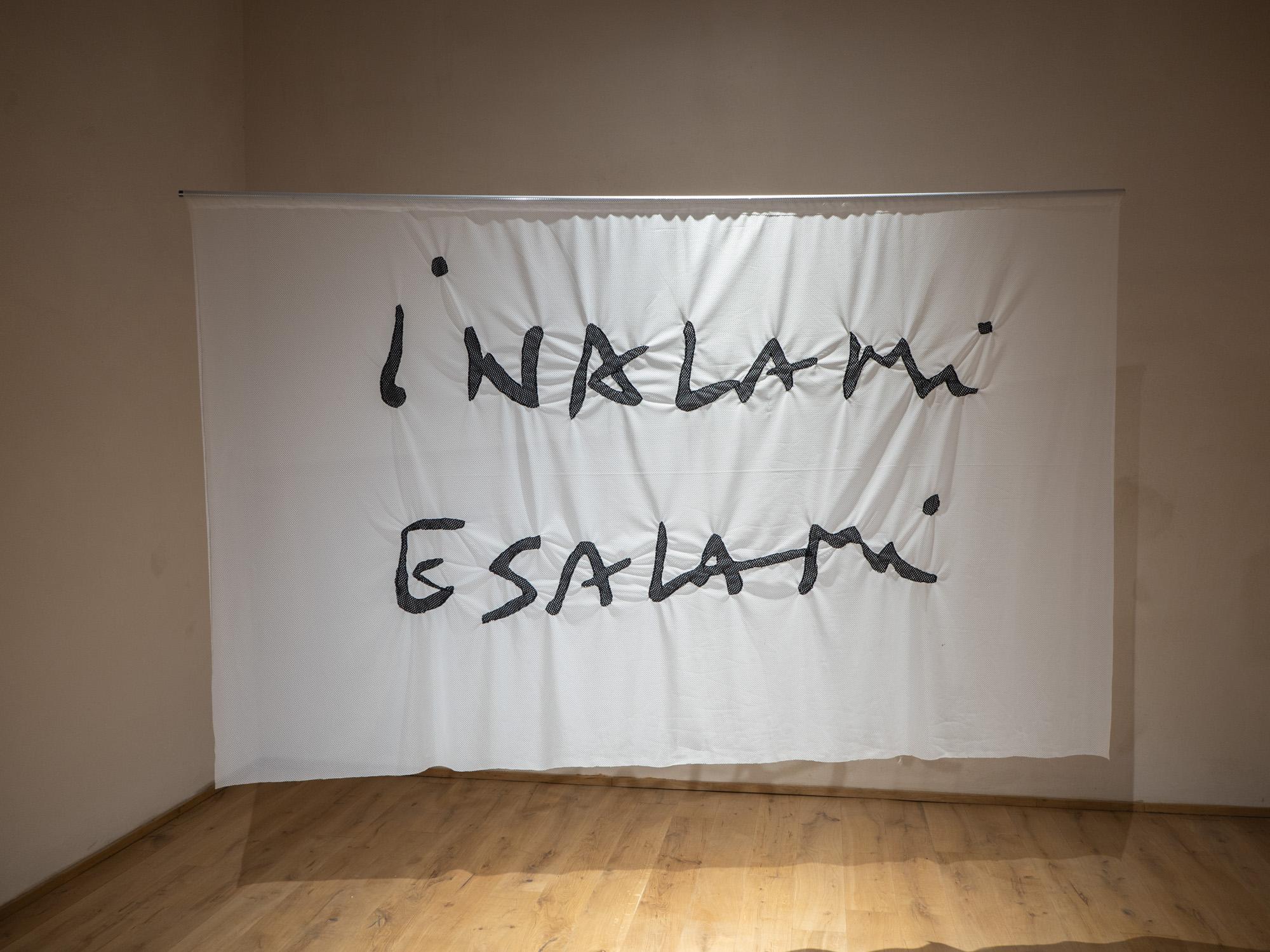 Sopra un semplice striscione bianco l’artista cuce in nero la frase «Inalami esalami», elevando a protagonista dell’opera una scritta appuntata tra note varie sul suo taccuino.Giordano prosegue così l’indaginesui limiti tra sfera collettiva e privata: fa del banner, comunemente adoperato per diffondere messaggi su larga scala, il vessillo della sua intimitàtradotta nella fugace annotazione. L’opera diviene un “interstizio” tra spazio pubblico, luogo espositivo e artista in grado di, usando le parole del sociologoGiovanni Gasparini, “articolare processi di socializzazione, identificazione e adesione affettiva".