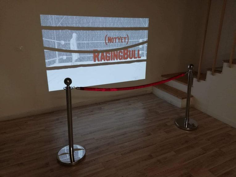 Not yet raging bull ( Toro non ancora scatenato) è l’opera che Sciorilli dona alla città di Cosenza. Il progetto nasce dall’assonanza della parola “Bocs”, ispirandosi ad un film sulla vita di Jake LaMotta, pugile statunitense, interpretato da De Niro e diretto da Martin Scorsese (1980). L’artista, attratto dai titoli di coda, descrive questo momento, così trascurato nei cinema, come l’ultimo istante della vita dell’uomo sulla terra. Accompagnato dall’ossessione dell’essere felice, Sciorilli spera che questo avvenga fino all’ultimo suo ”respiro”: se lo farà, la morte catturerà quell’attimo, donandogli un eterno momento di piacere. Filo rosso del suo lavoro, il senso dell’ultimo è in realtà sospeso: mettendo in loop i titoli di coda, rassicura lo spettatore ignaro di ciò che avviene dopo la morte. Congela il momento, illudendosi di una serenità perpetua. Utilizza, ancora, le immagini e i titoli di testa, mischiandoli con i titoli di coda, raccontando l’eterno concetto di inizio/fine, immaginario comune della morte. Anche in quest’opera, non troviamo il distacco tra arte e vita, descritta dall’artista come un immenso spettacolo teatrale dove gli oggetti di scena sono bensì reali. Per questo, nei titoli compaiono nomi di gente comune: genitori, amici, artisti e addetti ai lavori conosciuti nei giorni di residenza. Mostra la proiezione finale della sua vita: un ring dove si combatte il più grande avversario, il destino contro cui ci scontriamo ogni giorno. Giuseppe Sciorilli omaggia inoltre il padre, il suo “toro (non) scatenato” che ha vinto la più grande delle battaglie.