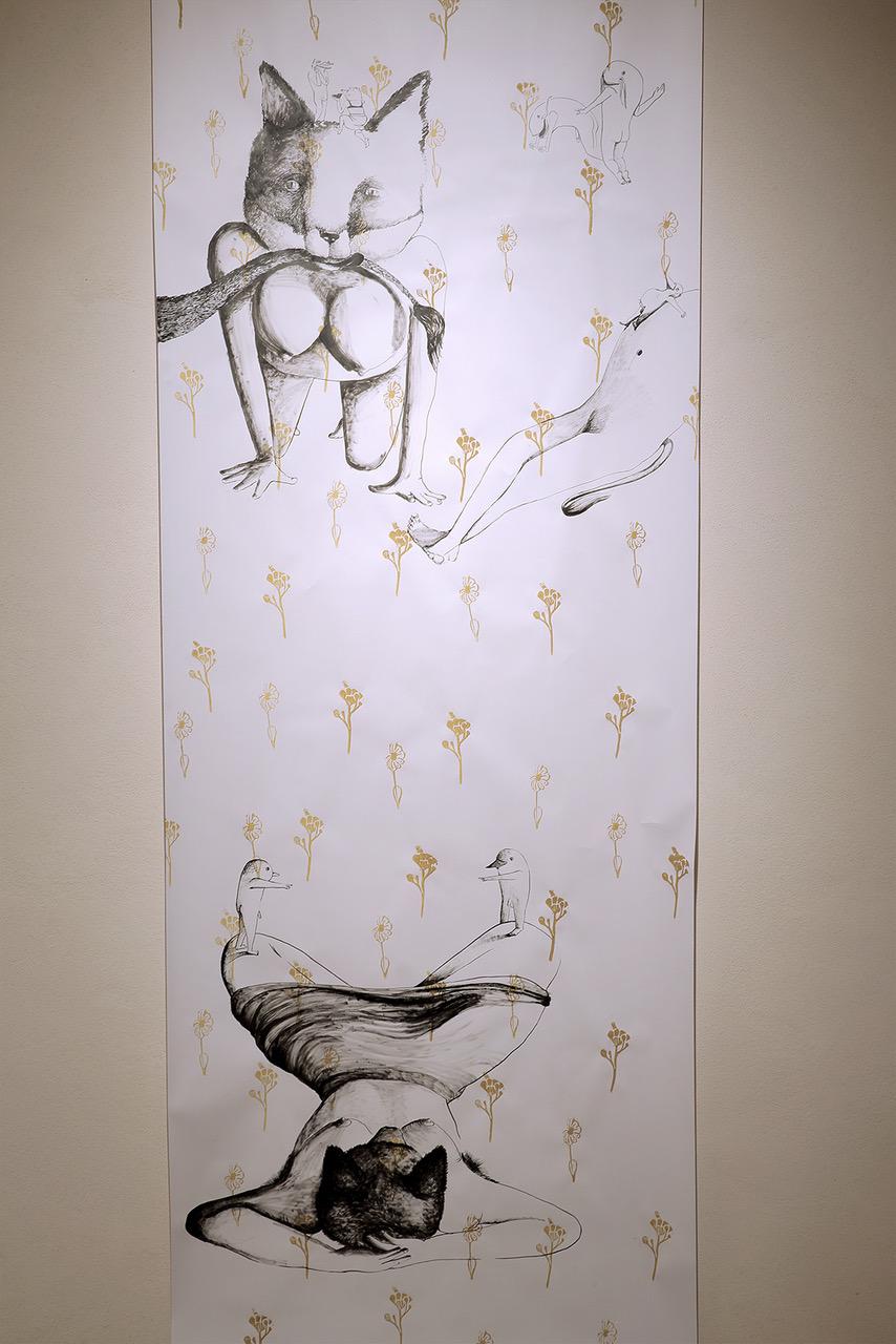 Cristina Gardumi realizza, a Cosenza, Erbario #1 #2 #3 #4, un opera composta da quattro disegni e un file audio dal titolo De Rerum Natura, conversazione che l’artista ha avuto con donne del luogo, riguardo ai grandi temi della bestialità, del rapporto con le bestie, della rappresentazioni degli animali nel mondo dell’arte. L’intenzione è quella di realizzare un microcosmo costituito da una scenografia murale di carta da parati autoprodotta che rappresenta un insieme di erbe, fiori, molti dei quali sono stati inspirati dalla stagione e dal contesto in cui si trova. Protagonisti dell’opera sono gli attori zoomorfi, caratteristici del suo percorso artistico, che seguono delle storie indecifrabili che ognuno può trarre osservando senza avere esattamente una successione degli episodi. Filo conduttore è la sessualità femminile e in particolare modo il mito di Persefone e quindi la successione delle stagioni. La figura mitologica, secondo Cristina Gardumi, rappresenta al meglio il suo concetto di femminilità: un insieme di mistero e possibilità inespresse che devono ancora trovare una loro strada per venire fuori nel mondo di oggi. I suoi personaggi fiabeschi vogliono quindi aiutare l’artista a capire la relazione tra la contemporaneità e l’essere donna, la gestione del corpo, la sessualità.