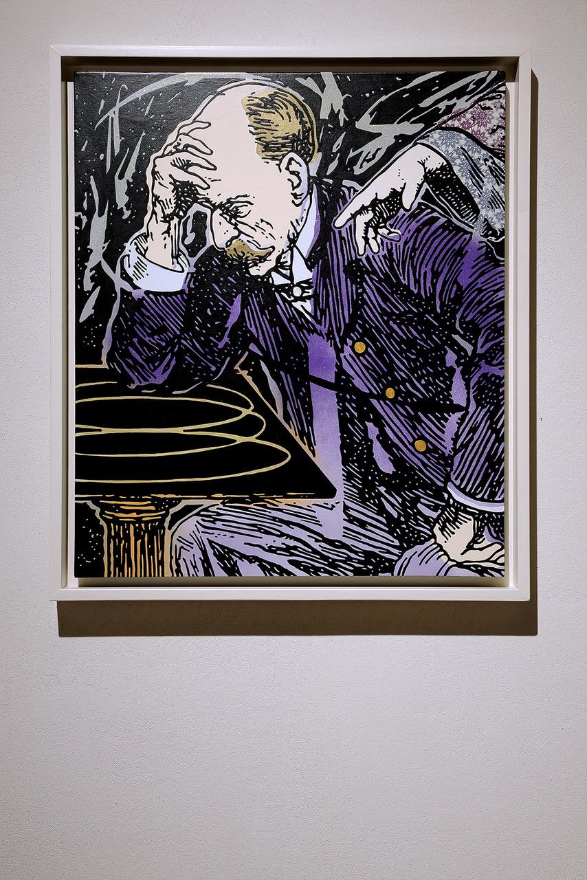 Proponendo un lavoro simile nell’impianto compositivo alle opere aventi per soggetto individui nell’atto di dipingere, a Cosenza Gabriele Arruzzo si rapporta in modo diretto con il territorio realizzando un’opera ispirata alla dottrina dell’abate Gioacchino da Fiore, nato a Celico nel 1130 circa. Nel dipinto è evidente il riferimento al Liber Figurarum (Il Libro delle Figure), capolavoro della letteratura figurale del Medioevo, citato come opera gioachimita nella Cronica di Salimbene de Adam da Parma (XIII secolo). Il personaggio raffigurato è un pensatore in abiti borghesi ritratto in un momento di grande concentrazione, mentre pone il suo sguardo su una figura composta da tre cerchi intersecati a vicenda e inanellati a spirale. Tale composizione geometrica è presente in una tavola illustrata del Liber Figurarum come simbolo della storia umana suddivisa in tre Età (l’età del Padre, l’età del Figlio, l’età dello Spirito Santo) secondo la teologia trinitaria del monaco calabrese. I tre cerchi sono indicati da una mano esterna allo spazio geometrico che, posta in diagonale in alto a destra, guida l’occhio dell’osservatore verso il punto più significativo di tutto il dipinto.