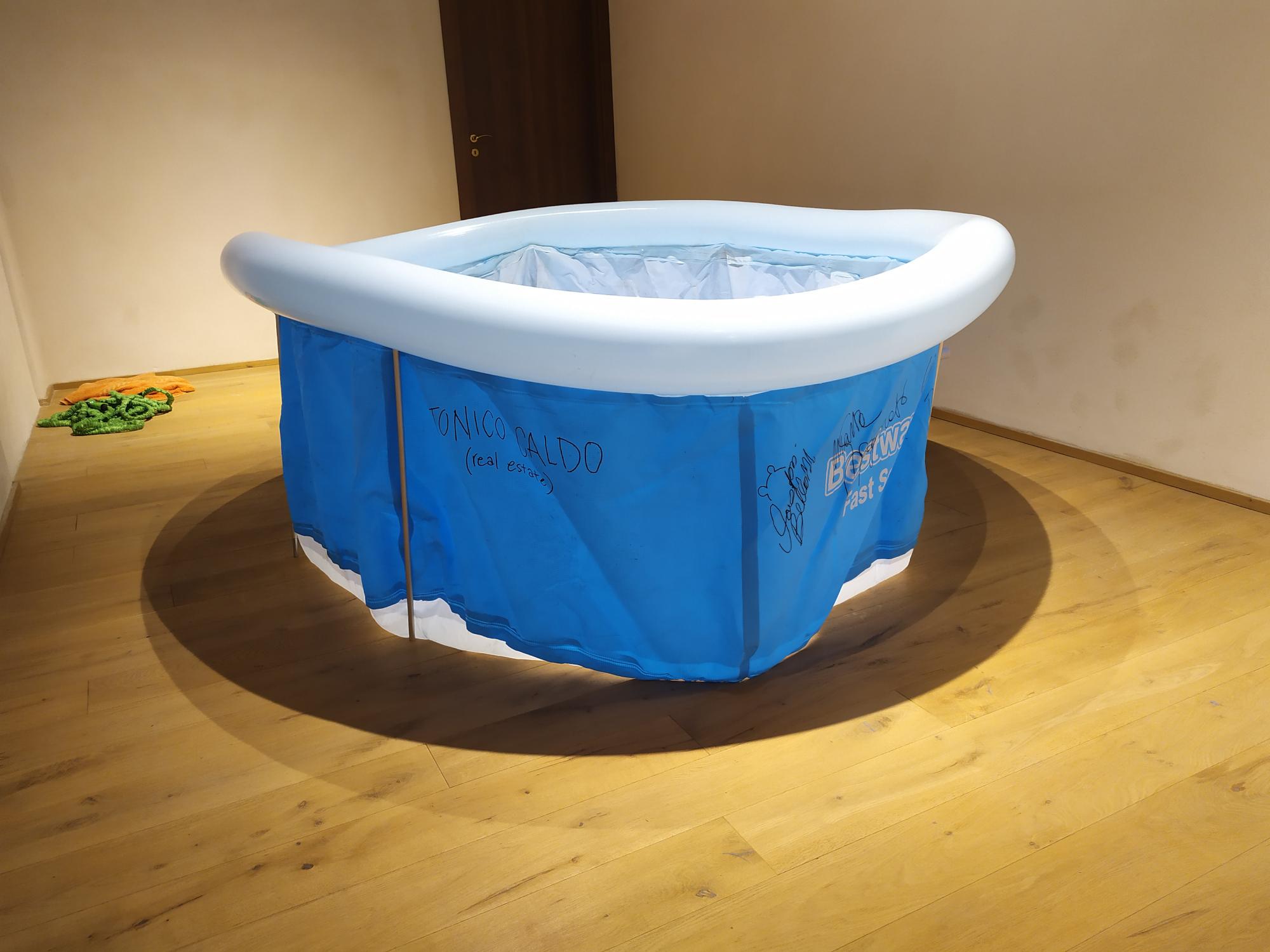 Gli artisti della residenza di luglio producono collettivamente un’opera funzionale. Un oggetto, come la piscina, che ha dato reale refrigerio agli artisti durante un periodo di residenza molto caldo, ora esposto per recuperarne anche la sua valenza estetica e documentaria.