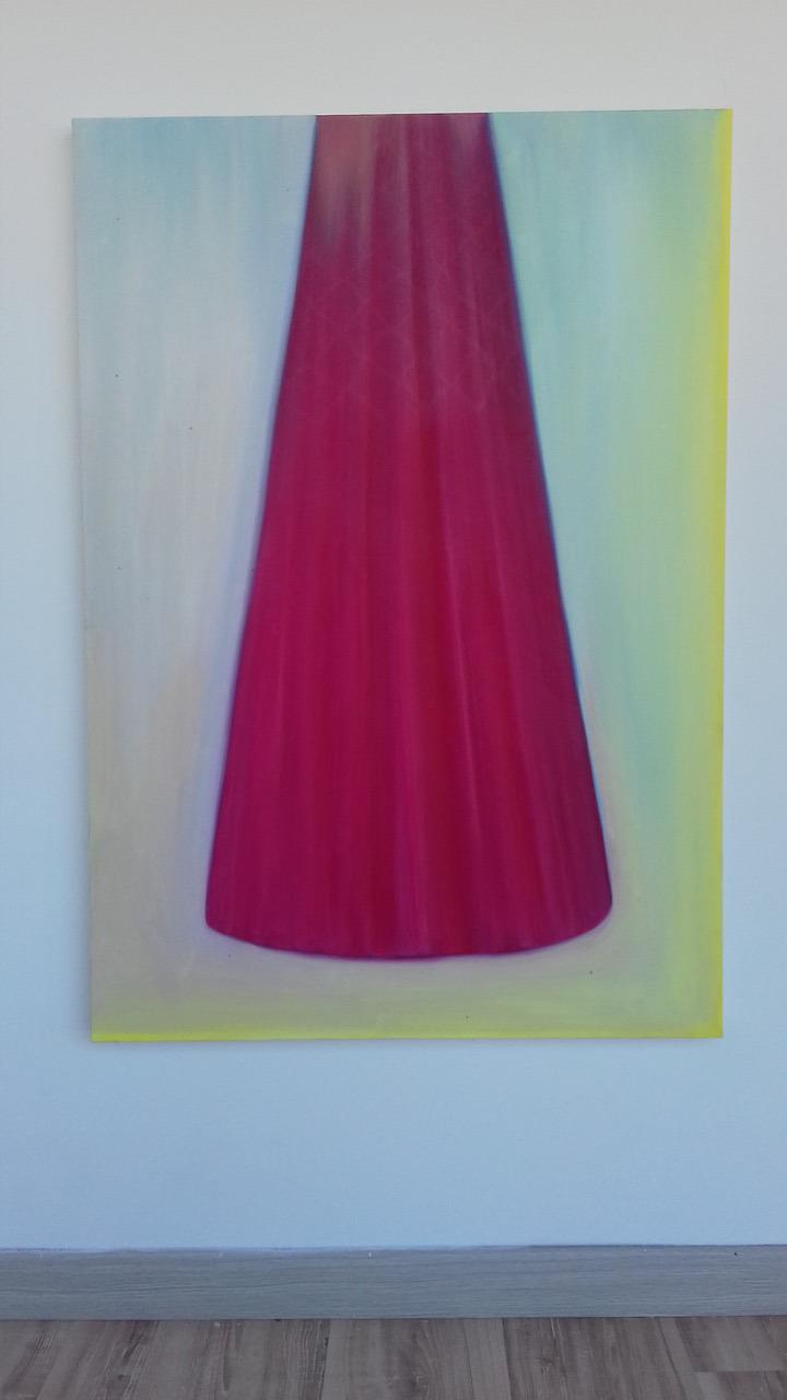 Il periodo di residenza presso i BoCs Art di Cosenza ha significato molto per Martina Roberts, che per la prima volta si è misurata con un lavoro artistico più strutturato e organizzato e meno istintivo. Ha sempre lavorato con il disegno, tecnica veloce che permette perciò di registrare i cambi d’umore e l’inconscio, ma in occasione del suo ritorno a Cosenza realizza una tela in cui dominante è il colore rosso. Non essendo partita con un progetto già fissato, si è aperta agli stimoli che le hanno fornito alcuni semplici oggetti (soprattutto vasi, elementi che ritornano quasi ossessivamente nella sua produzione artistica) oppure le conversazioni a due a due che ha ascoltato nei BoCs tra gli artisti, per le strade di Cosenza o alle quali ha partecipato lei stessa. Nella tela donata al BoCs Museum emerge un altro punto cardine della sua ricerca: i tessuti. Di fatti, dopo essersi formata come pittrice tradizionale, si è avvicinata al design, lavorando per almeno quindici anni sul tessuto in digitale. Proprio questa esperienza, associata al suo amore per il teatro, le ha permesso di cogliere la spettacolarità dei vestiti arbëreshë, dalle gonne plissettate e soprattutto variopinte. Un’antica foto di due donne abbigliate con tali vesti, reperita presso la Casa delle Culture a Cosenza, è stata posta dall’artista di fronte all’entrata del BoCs come punto di partenza per interpretare la sua esperienza in città; esperienza che si origina dunque dalla percezione di determinati colori: il rosso e il giallo soprattutto, impiegati non più nel disegno a pennarello, ma ricorrendo alla pittura vera e propria. L’idea del Corpo/vaso nasce da una foto scattata da Simone Camerlengo, altro artista della stessa residenza, in cui il corpo di Martina sembrava aver assunto la forma di uno dei.